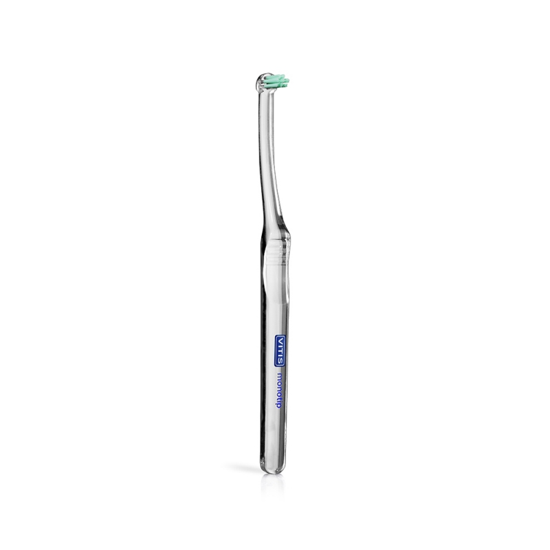 monotip is a special round-headed toothbrush designed to facilitate the cleaning of crowded teeth, fixed bridges, and orthodontic appliances.